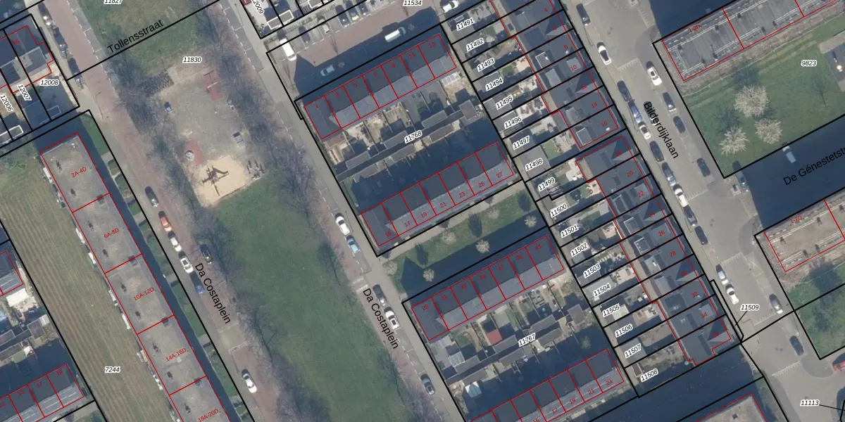 Het perceel waarop Da Costaplein 19 staat heeft een oppervlakte van 1630 m². Dit is een zeer groot perceel. De perceeloppervlakte wordt geregistreerd door het Kadaster. Gedetailleerde informatie over de maten van dit perceel kunt u vinden in het rapport Kadastrale kaart met maatvoering van Da Costaplein 19.