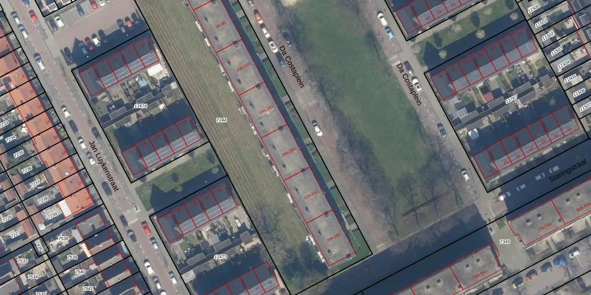 Het perceel waarop Da Costaplein 20-B staat heeft een oppervlakte van 3755 m². Dit is een zeer groot perceel. De perceeloppervlakte wordt geregistreerd door het Kadaster. Gedetailleerde informatie over de maten van dit perceel kunt u vinden in het rapport Kadastrale kaart met maatvoering van Da Costaplein 20-B.