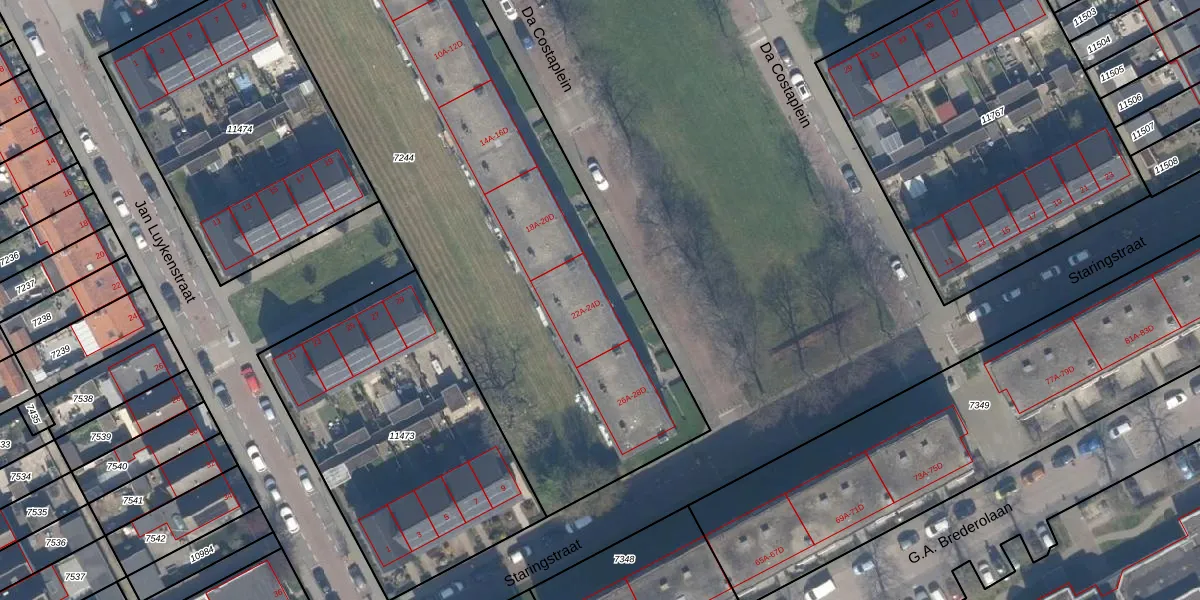 Het perceel waarop Da Costaplein 22-C staat heeft een oppervlakte van 3755 m². Dit is een zeer groot perceel. De perceeloppervlakte wordt geregistreerd door het Kadaster. Gedetailleerde informatie over de maten van dit perceel kunt u vinden in het rapport Kadastrale kaart met maatvoering van Da Costaplein 22-C.