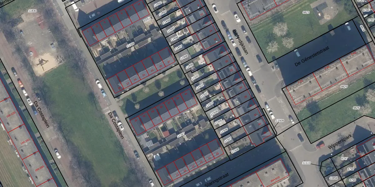 Het perceel waarop Da Costaplein 41 staat heeft een oppervlakte van 1785 m². Dit is een zeer groot perceel. De perceeloppervlakte wordt geregistreerd door het Kadaster. Gedetailleerde informatie over de maten van dit perceel kunt u vinden in het rapport Kadastrale kaart met maatvoering van Da Costaplein 41.