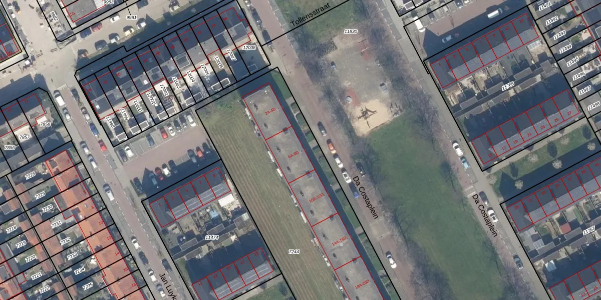 Het perceel waarop Da Costaplein 8-C staat heeft een oppervlakte van 3755 m². Dit is een zeer groot perceel. De perceeloppervlakte wordt geregistreerd door het Kadaster. Gedetailleerde informatie over de maten van dit perceel kunt u vinden in het rapport Kadastrale kaart met maatvoering van Da Costaplein 8-C.