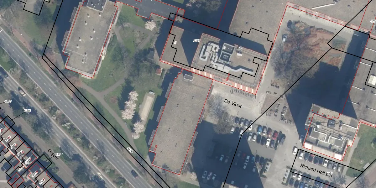 Het perceel waarop De Vloot 89 staat heeft een oppervlakte van 2,1 ha. Dit is een zeer groot perceel. De perceeloppervlakte wordt geregistreerd door het Kadaster. Gedetailleerde informatie over de maten van dit perceel kunt u vinden in het rapport Kadastrale kaart met maatvoering van De Vloot 89.