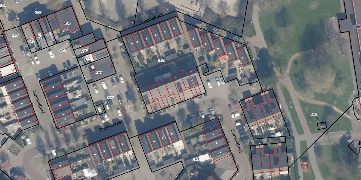 Dunantdreef 110 is gelegen op kadastraal perceel MSS00A2236. Deze kadastrale aanduiding is uniek en wordt gebruikt door het Kadaster om eigendomsrechten en andere zakelijke rechten vast te leggen. Het perceel maakt onderdeel uit van de kadastrale gemeente Maassluis.