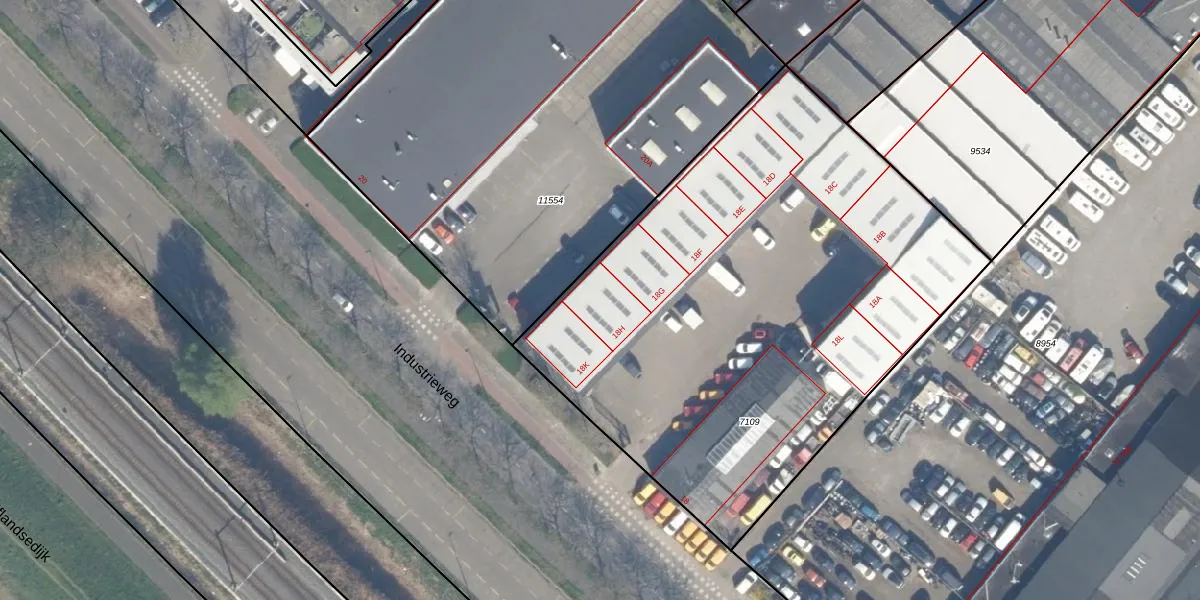 Het perceel waarop Industrieweg 18-H staat heeft een oppervlakte van 3173 m². Dit is een zeer groot perceel. De perceeloppervlakte wordt geregistreerd door het Kadaster. Gedetailleerde informatie over de maten van dit perceel kunt u vinden in het rapport Kadastrale kaart met maatvoering van Industrieweg 18-H.