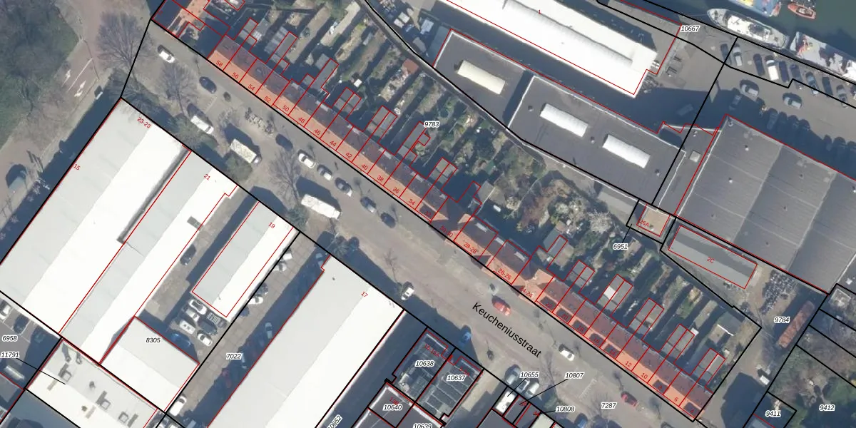 Het perceel waarop Keucheniusstraat 32 staat heeft een oppervlakte van 6380 m². Dit is een zeer groot perceel. De perceeloppervlakte wordt geregistreerd door het Kadaster. Gedetailleerde informatie over de maten van dit perceel kunt u vinden in het rapport Kadastrale kaart met maatvoering van Keucheniusstraat 32.