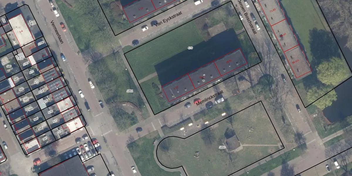 Het perceel waarop Memlinckstraat 3 staat heeft een oppervlakte van 2594 m². Dit is een zeer groot perceel. De perceeloppervlakte wordt geregistreerd door het Kadaster. Gedetailleerde informatie over de maten van dit perceel kunt u vinden in het rapport Kadastrale kaart met maatvoering van Memlinckstraat 3.