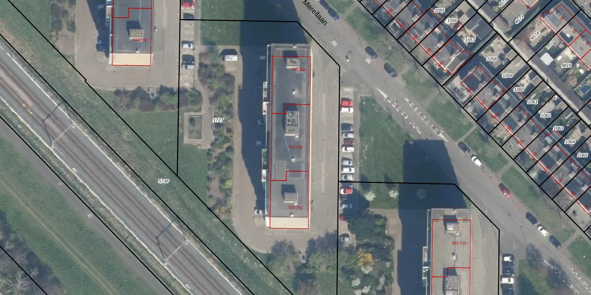 Het perceel waarop Merellaan 767 staat heeft een oppervlakte van 4262 m². Dit is een zeer groot perceel. De perceeloppervlakte wordt geregistreerd door het Kadaster. Gedetailleerde informatie over de maten van dit perceel kunt u vinden in het rapport Kadastrale kaart met maatvoering van Merellaan 767.
