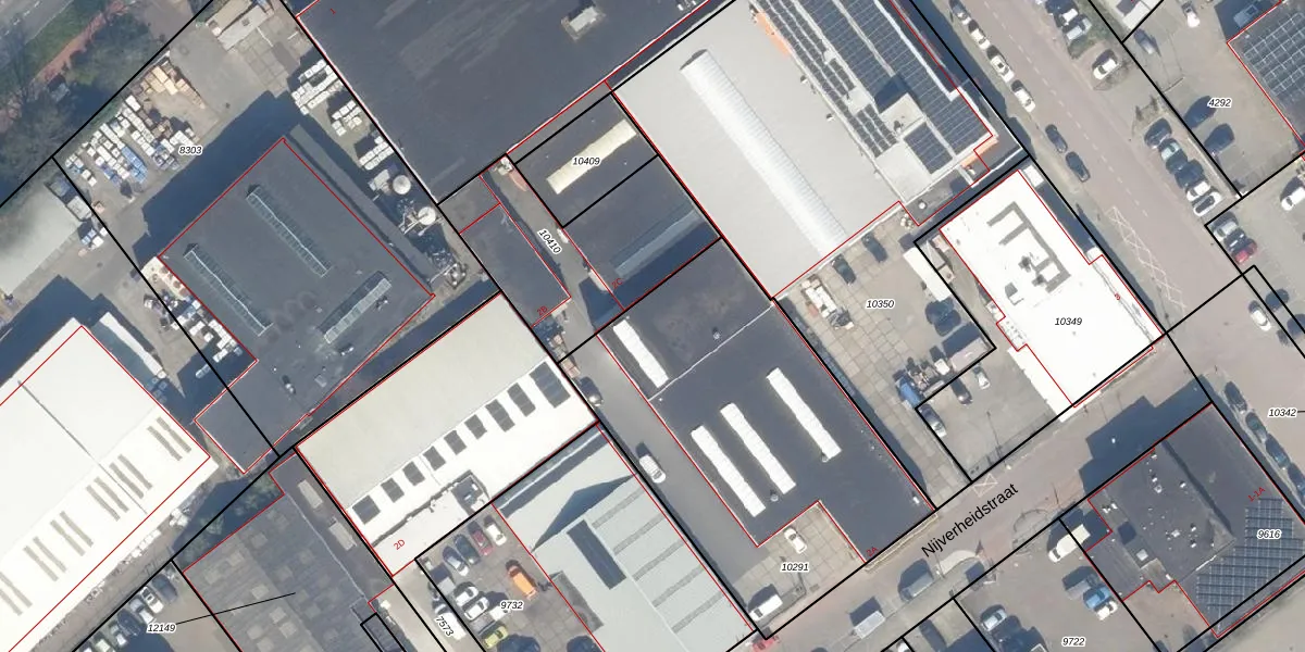 Het perceel waarop Nijverheidstraat 2-B staat heeft een oppervlakte van 1715 m². Dit is een zeer groot perceel. De perceeloppervlakte wordt geregistreerd door het Kadaster. Gedetailleerde informatie over de maten van dit perceel kunt u vinden in het rapport Kadastrale kaart met maatvoering van Nijverheidstraat 2-B.