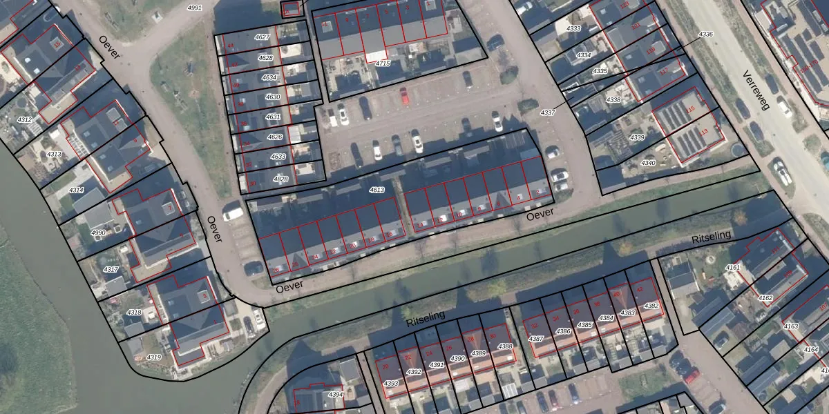 Het perceel waarop Oever 14 staat heeft een oppervlakte van 1375 m². Dit is een zeer groot perceel. De perceeloppervlakte wordt geregistreerd door het Kadaster. Gedetailleerde informatie over de maten van dit perceel kunt u vinden in het rapport Kadastrale kaart met maatvoering van Oever 14.