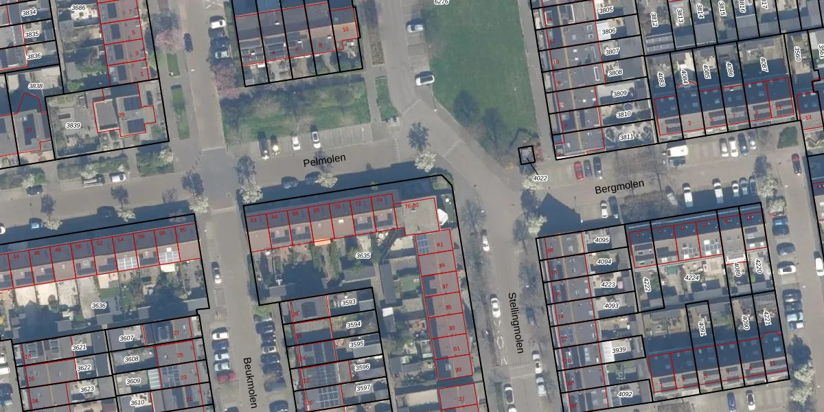 Het perceel waarop Pelmolen 76 staat heeft een oppervlakte van 3158 m². Dit is een zeer groot perceel. De perceeloppervlakte wordt geregistreerd door het Kadaster. Gedetailleerde informatie over de maten van dit perceel kunt u vinden in het rapport Kadastrale kaart met maatvoering van Pelmolen 76.