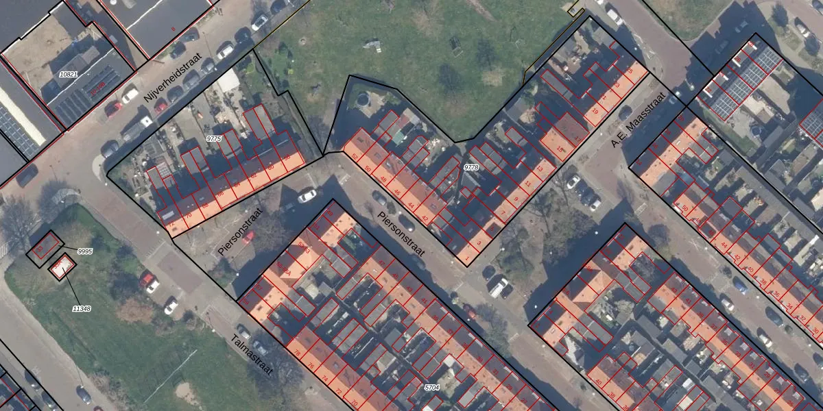 Het perceel waarop Piersonstraat 44 staat heeft een oppervlakte van 1895 m². Dit is een zeer groot perceel. De perceeloppervlakte wordt geregistreerd door het Kadaster. Gedetailleerde informatie over de maten van dit perceel kunt u vinden in het rapport Kadastrale kaart met maatvoering van Piersonstraat 44.