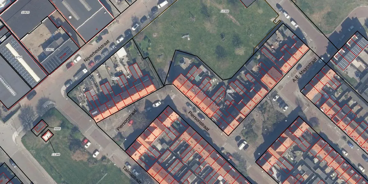 Het perceel waarop Piersonstraat 50 staat heeft een oppervlakte van 1895 m². Dit is een zeer groot perceel. De perceeloppervlakte wordt geregistreerd door het Kadaster. Gedetailleerde informatie over de maten van dit perceel kunt u vinden in het rapport Kadastrale kaart met maatvoering van Piersonstraat 50.