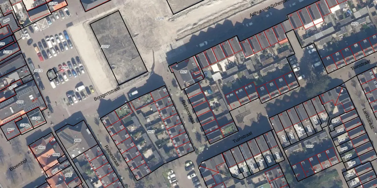Het perceel waarop Ridderstraat 1 staat heeft een oppervlakte van 6640 m². Dit is een zeer groot perceel. De perceeloppervlakte wordt geregistreerd door het Kadaster. Gedetailleerde informatie over de maten van dit perceel kunt u vinden in het rapport Kadastrale kaart met maatvoering van Ridderstraat 1.