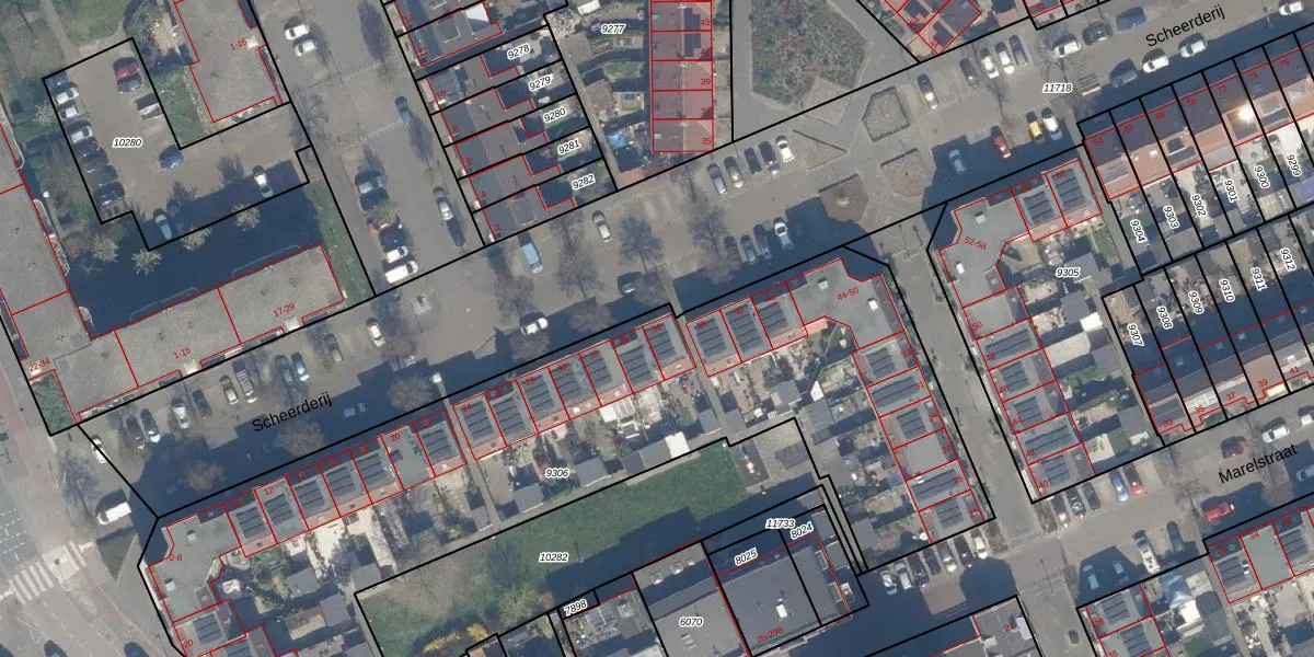Scheerderij 36 is gelegen op kadastraal perceel MSS00D9306. Deze kadastrale aanduiding is uniek en wordt gebruikt door het Kadaster om eigendomsrechten en andere zakelijke rechten vast te leggen. Het perceel maakt onderdeel uit van de kadastrale gemeente Maassluis.