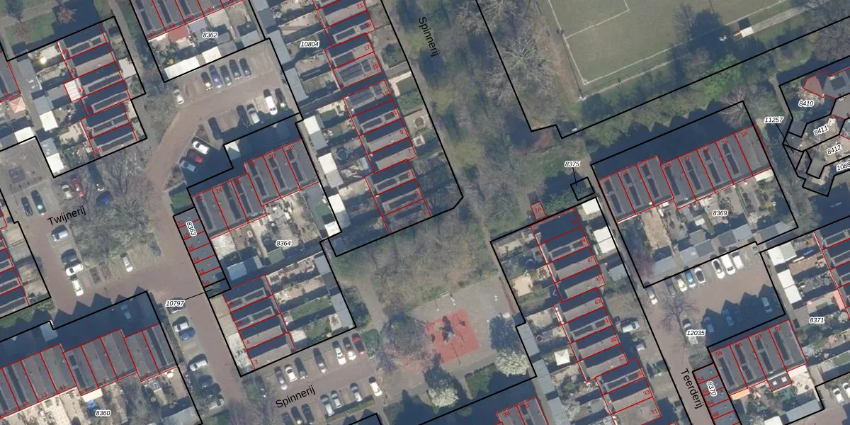 Het perceel waarop Spinnerij 1 staat heeft een oppervlakte van 2185 m². Dit is een zeer groot perceel. De perceeloppervlakte wordt geregistreerd door het Kadaster. Gedetailleerde informatie over de maten van dit perceel kunt u vinden in het rapport Kadastrale kaart met maatvoering van Spinnerij 1.