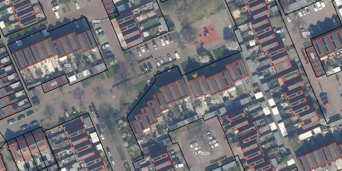 Het perceel waarop Spinnerij 14 staat heeft een oppervlakte van 9969 m². Dit is een zeer groot perceel. De perceeloppervlakte wordt geregistreerd door het Kadaster. Gedetailleerde informatie over de maten van dit perceel kunt u vinden in het rapport Kadastrale kaart met maatvoering van Spinnerij 14.