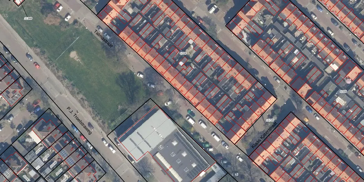 Het perceel waarop Talmastraat 60 staat heeft een oppervlakte van 3569 m². Dit is een zeer groot perceel. De perceeloppervlakte wordt geregistreerd door het Kadaster. Gedetailleerde informatie over de maten van dit perceel kunt u vinden in het rapport Kadastrale kaart met maatvoering van Talmastraat 60.