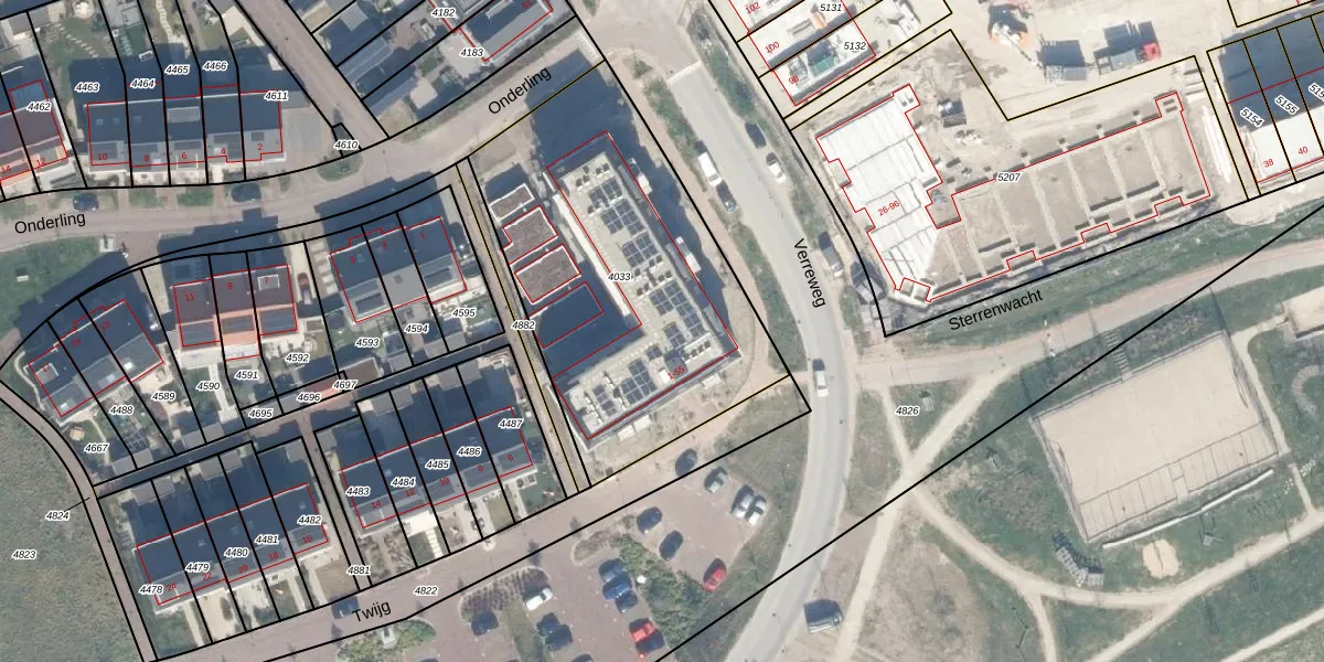 Het perceel waarop Twijg 17 staat heeft een oppervlakte van 1625 m². Dit is een zeer groot perceel. De perceeloppervlakte wordt geregistreerd door het Kadaster. Gedetailleerde informatie over de maten van dit perceel kunt u vinden in het rapport Kadastrale kaart met maatvoering van Twijg 17.