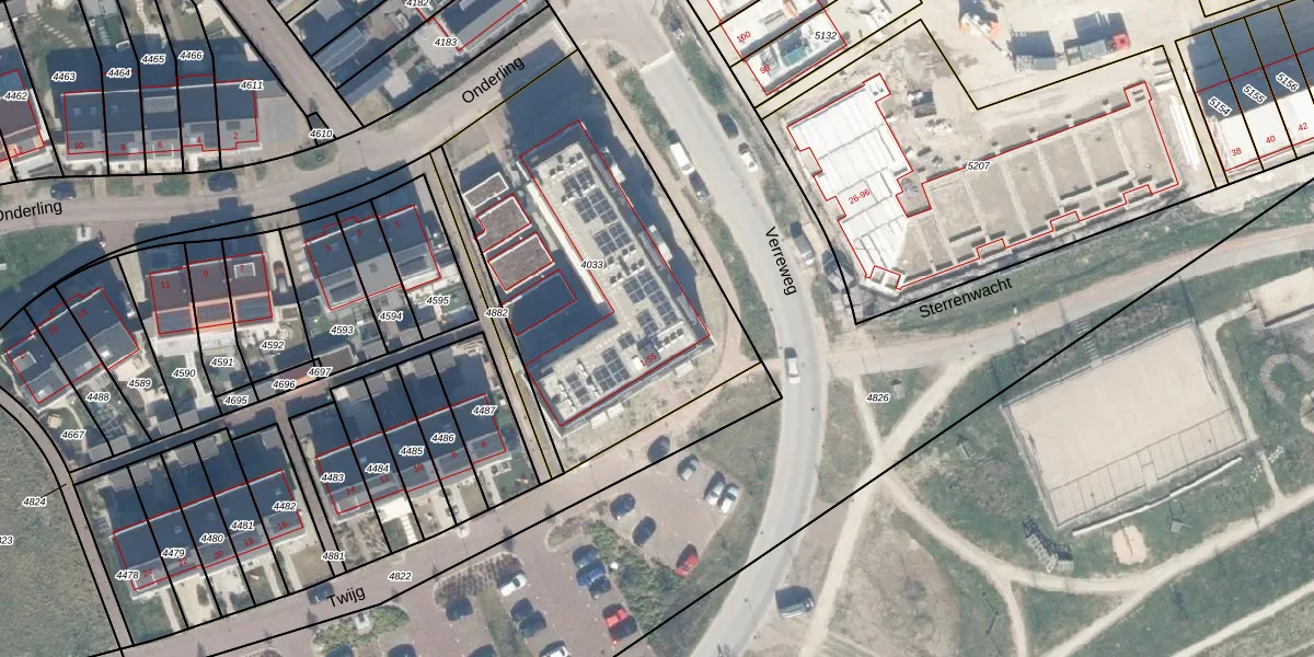 Het perceel waarop Twijg 23 staat heeft een oppervlakte van 1625 m². Dit is een zeer groot perceel. De perceeloppervlakte wordt geregistreerd door het Kadaster. Gedetailleerde informatie over de maten van dit perceel kunt u vinden in het rapport Kadastrale kaart met maatvoering van Twijg 23.