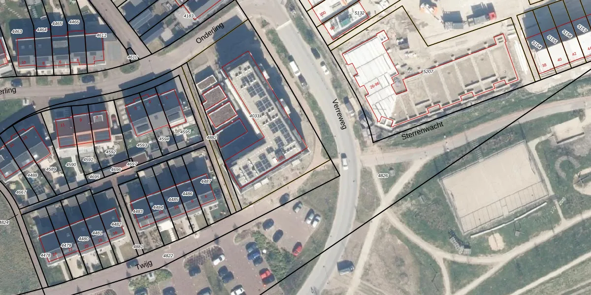 Het perceel waarop Twijg 53 staat heeft een oppervlakte van 1625 m². Dit is een zeer groot perceel. De perceeloppervlakte wordt geregistreerd door het Kadaster. Gedetailleerde informatie over de maten van dit perceel kunt u vinden in het rapport Kadastrale kaart met maatvoering van Twijg 53.