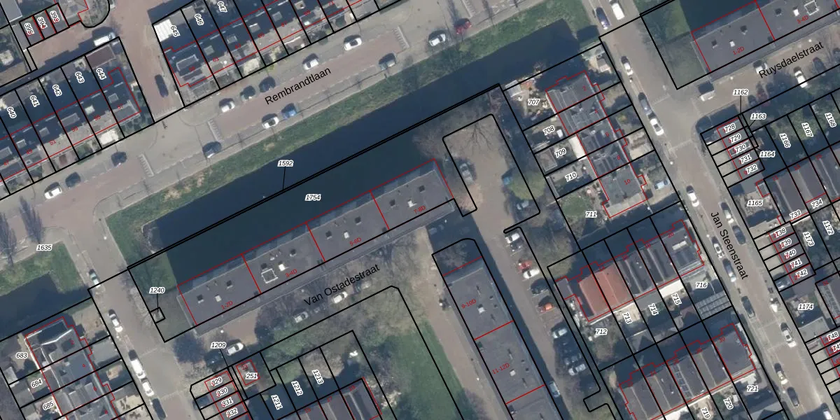 Het perceel waarop Van Ostadestraat 8-D staat heeft een oppervlakte van 3673 m². Dit is een zeer groot perceel. De perceeloppervlakte wordt geregistreerd door het Kadaster. Gedetailleerde informatie over de maten van dit perceel kunt u vinden in het rapport Kadastrale kaart met maatvoering van Van Ostadestraat 8-D.