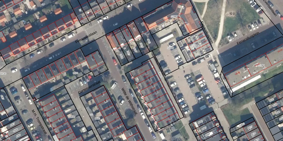 Het perceel waarop Witte de Withstraat 21 staat heeft een oppervlakte van 1100 m². Dit is een zeer groot perceel. De perceeloppervlakte wordt geregistreerd door het Kadaster. Gedetailleerde informatie over de maten van dit perceel kunt u vinden in het rapport Kadastrale kaart met maatvoering van Witte de Withstraat 21.
