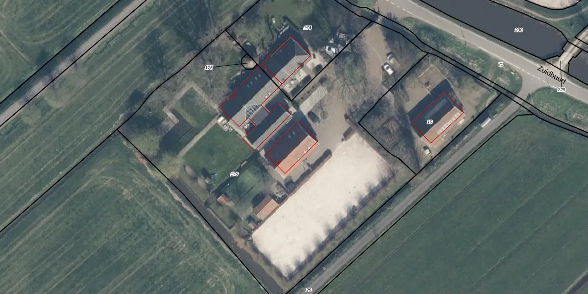 Het perceel waarop Zuidbuurt 10-B staat heeft een oppervlakte van 5185 m². Dit is een zeer groot perceel. De perceeloppervlakte wordt geregistreerd door het Kadaster. Gedetailleerde informatie over de maten van dit perceel kunt u vinden in het rapport Kadastrale kaart met maatvoering van Zuidbuurt 10-B.