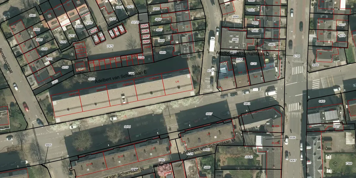 Adelbert van Scharnlaan E 5 is gelegen op kadastraal perceel HEE03A7411. Deze kadastrale aanduiding is uniek en wordt gebruikt door het Kadaster om eigendomsrechten en andere zakelijke rechten vast te leggen. Het perceel maakt onderdeel uit van de kadastrale gemeente Heer.