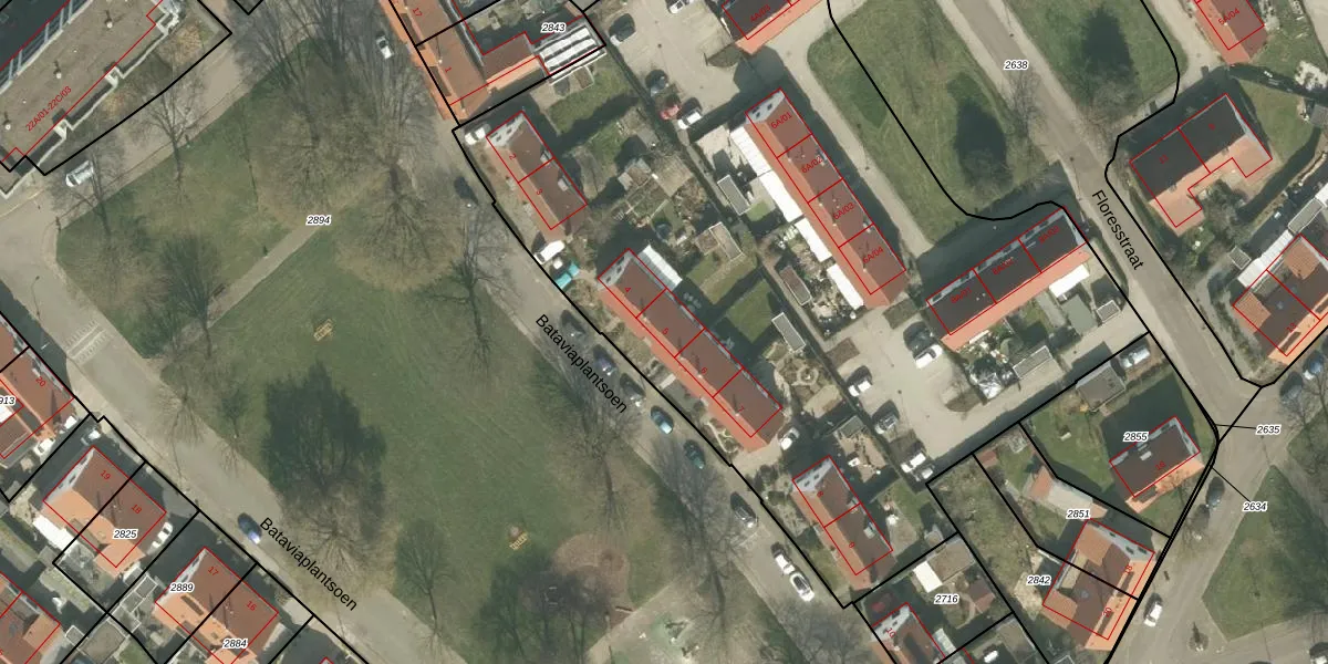 Het perceel waarop Bataviaplantsoen 5 staat heeft een oppervlakte van 5758 m². Dit is een zeer groot perceel. De perceeloppervlakte wordt geregistreerd door het Kadaster. Gedetailleerde informatie over de maten van dit perceel kunt u vinden in het rapport Kadastrale kaart met maatvoering van Bataviaplantsoen 5.