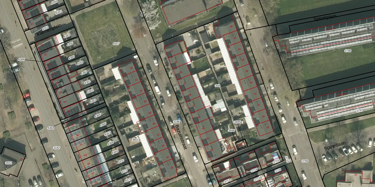 Het perceel waarop Bazuinstraat 39 staat heeft een oppervlakte van 3190 m². Dit is een zeer groot perceel. De perceeloppervlakte wordt geregistreerd door het Kadaster. Gedetailleerde informatie over de maten van dit perceel kunt u vinden in het rapport Kadastrale kaart met maatvoering van Bazuinstraat 39.