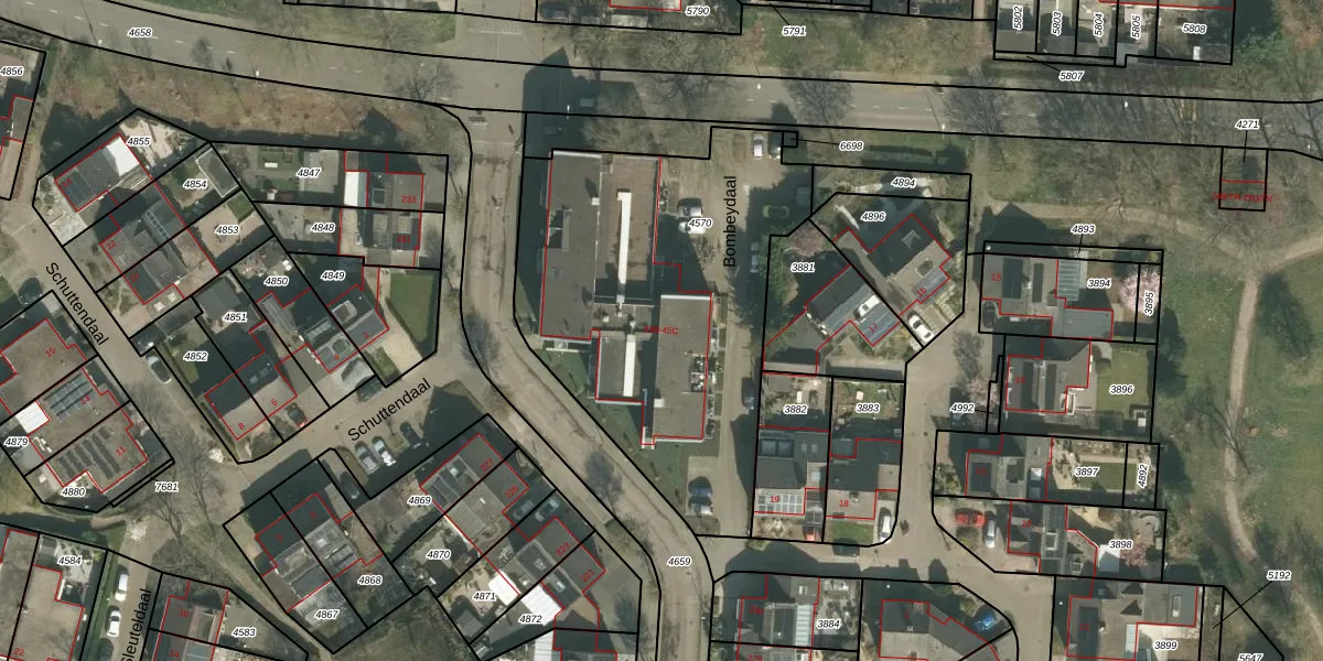 Het perceel waarop Bombeydaal 42-C staat heeft een oppervlakte van 1830 m². Dit is een zeer groot perceel. De perceeloppervlakte wordt geregistreerd door het Kadaster. Gedetailleerde informatie over de maten van dit perceel kunt u vinden in het rapport Kadastrale kaart met maatvoering van Bombeydaal 42-C.
