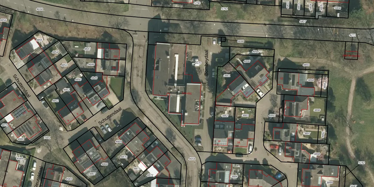 Het perceel waarop Bombeydaal 45-C staat heeft een oppervlakte van 1830 m². Dit is een zeer groot perceel. De perceeloppervlakte wordt geregistreerd door het Kadaster. Gedetailleerde informatie over de maten van dit perceel kunt u vinden in het rapport Kadastrale kaart met maatvoering van Bombeydaal 45-C.