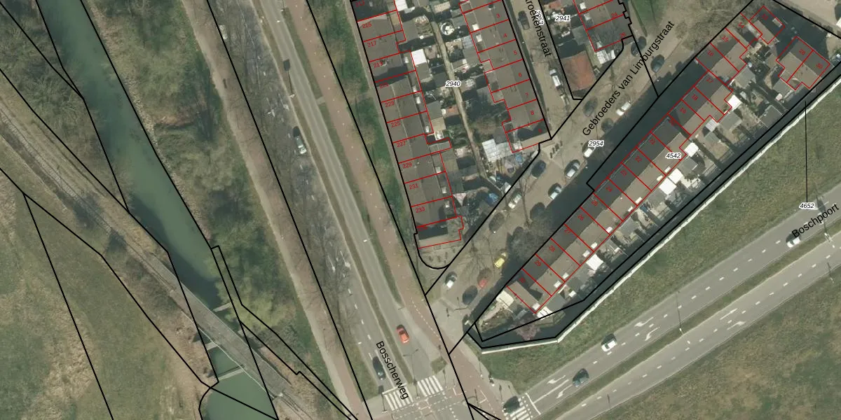 Bosscherweg 233 is gelegen op kadastraal perceel MTT00D2940. Deze kadastrale aanduiding is uniek en wordt gebruikt door het Kadaster om eigendomsrechten en andere zakelijke rechten vast te leggen. Het perceel maakt onderdeel uit van de kadastrale gemeente Maastricht.