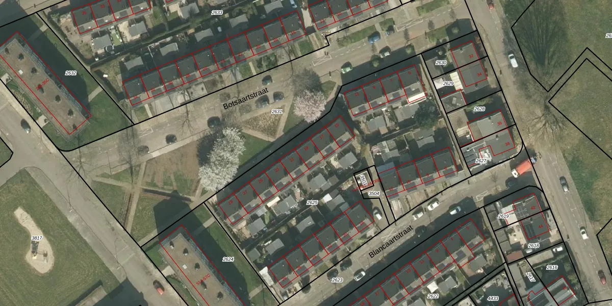 Het perceel waarop Botsaartstraat 19 staat heeft een oppervlakte van 3360 m². Dit is een zeer groot perceel. De perceeloppervlakte wordt geregistreerd door het Kadaster. Gedetailleerde informatie over de maten van dit perceel kunt u vinden in het rapport Kadastrale kaart met maatvoering van Botsaartstraat 19.