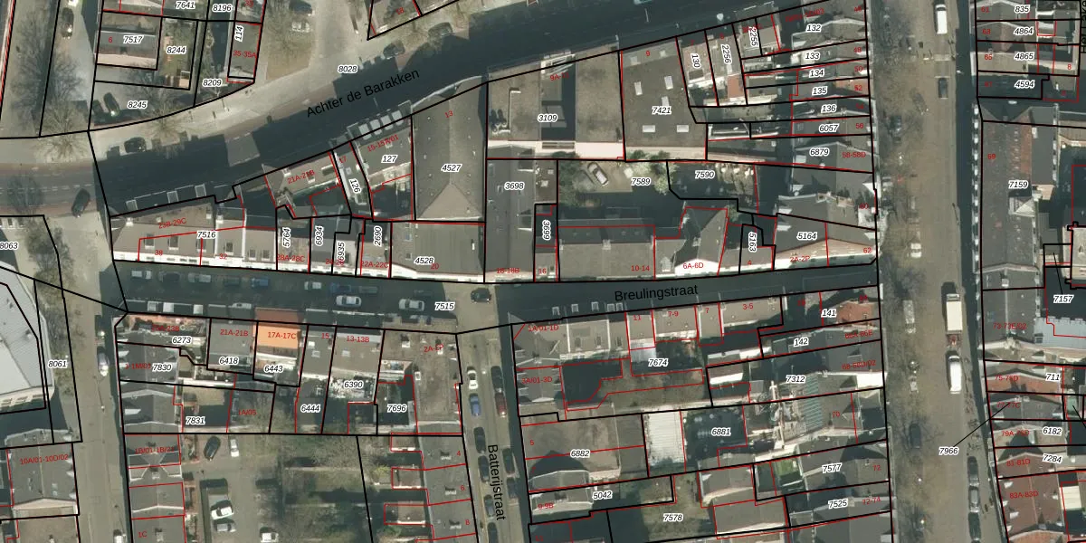 Het perceel waarop Breulingstraat 16 staat heeft een oppervlakte van 60 m². Dit is een klein perceel. De perceeloppervlakte wordt geregistreerd door het Kadaster. Gedetailleerde informatie over de maten van dit perceel kunt u vinden in het rapport Kadastrale kaart met maatvoering van Breulingstraat 16.