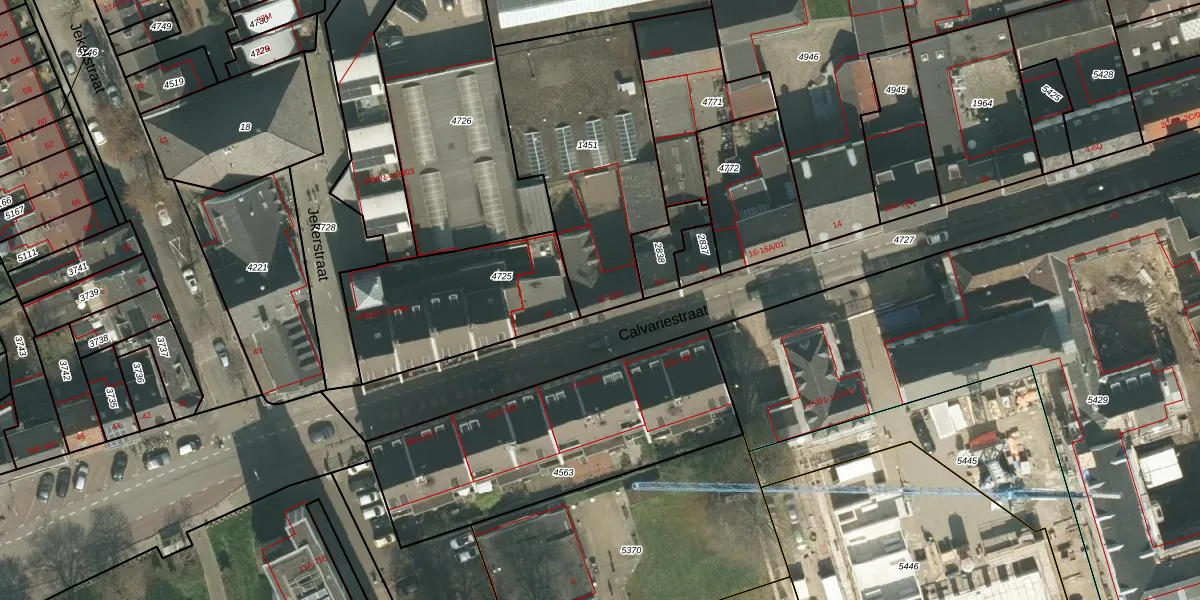 Het perceel waarop Calvariestraat 22-A staat heeft een oppervlakte van 900 m². Dit is een groot perceel. De perceeloppervlakte wordt geregistreerd door het Kadaster. Gedetailleerde informatie over de maten van dit perceel kunt u vinden in het rapport Kadastrale kaart met maatvoering van Calvariestraat 22-A.