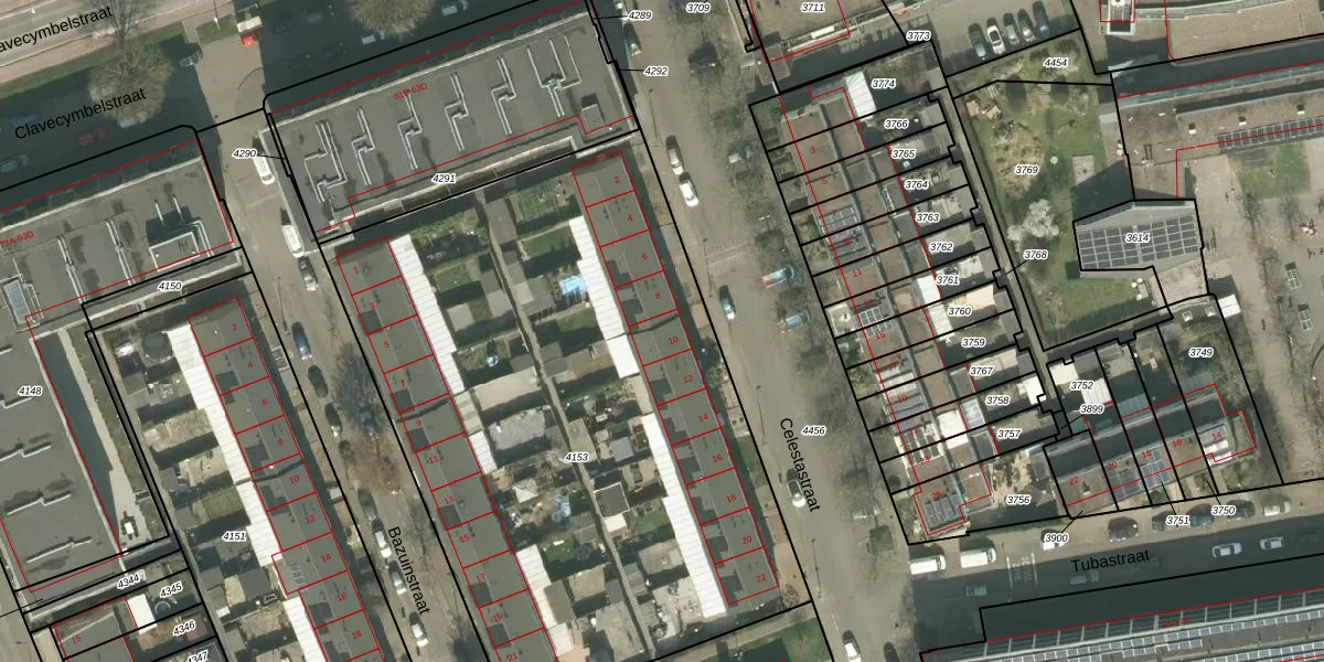 Het perceel waarop Celestastraat 10 staat heeft een oppervlakte van 3826 m². Dit is een zeer groot perceel. De perceeloppervlakte wordt geregistreerd door het Kadaster. Gedetailleerde informatie over de maten van dit perceel kunt u vinden in het rapport Kadastrale kaart met maatvoering van Celestastraat 10.