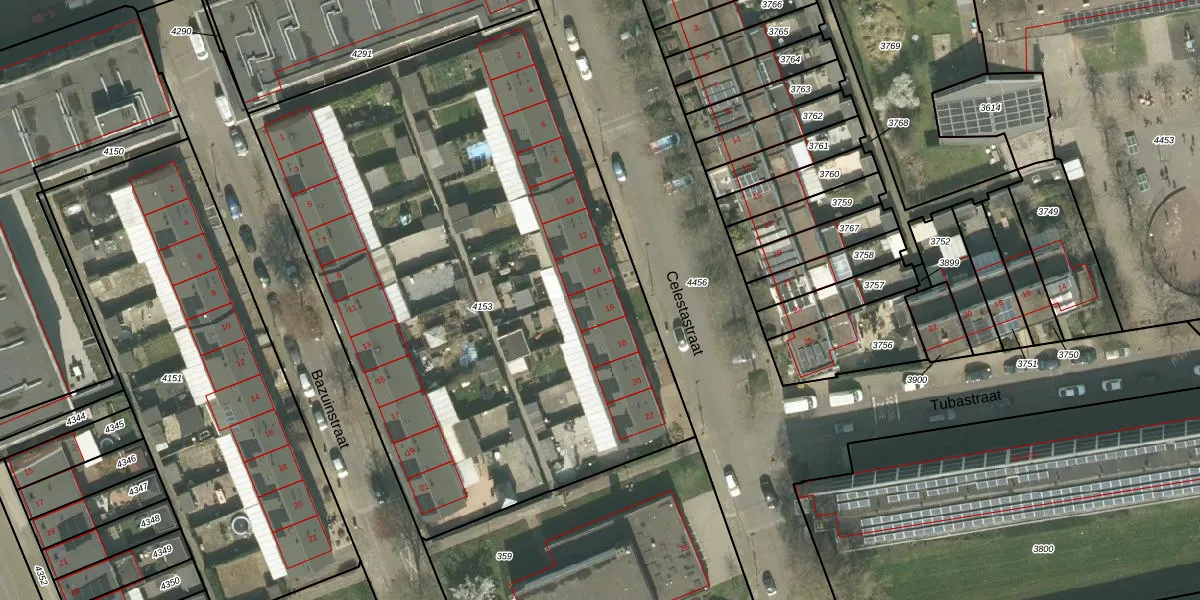 Het perceel waarop Celestastraat 16 staat heeft een oppervlakte van 3826 m². Dit is een zeer groot perceel. De perceeloppervlakte wordt geregistreerd door het Kadaster. Gedetailleerde informatie over de maten van dit perceel kunt u vinden in het rapport Kadastrale kaart met maatvoering van Celestastraat 16.