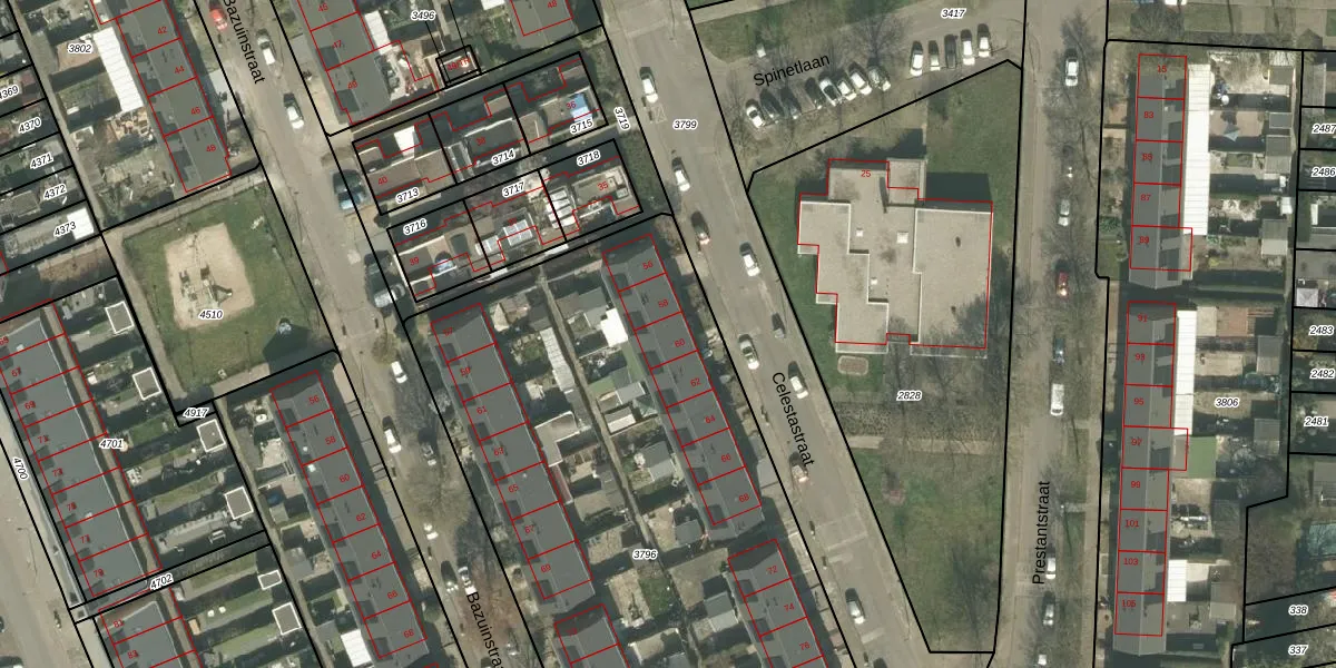 Het perceel waarop Celestastraat 60 staat heeft een oppervlakte van 4218 m². Dit is een zeer groot perceel. De perceeloppervlakte wordt geregistreerd door het Kadaster. Gedetailleerde informatie over de maten van dit perceel kunt u vinden in het rapport Kadastrale kaart met maatvoering van Celestastraat 60.