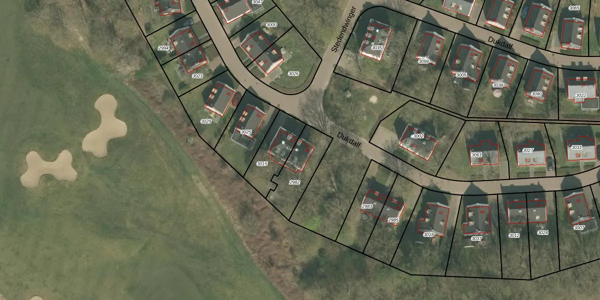 Het perceel waarop Dukdalf 36 staat heeft een oppervlakte van 303 m². Dit is een groot perceel. De perceeloppervlakte wordt geregistreerd door het Kadaster. Gedetailleerde informatie over de maten van dit perceel kunt u vinden in het rapport Kadastrale kaart met maatvoering van Dukdalf 36.