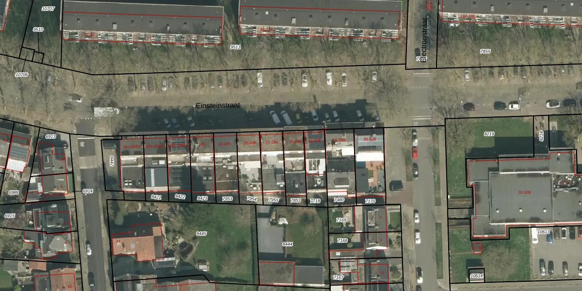 Het perceel waarop Einsteinstraat 24-B staat heeft een oppervlakte van 182 m². Dit is een middelgroot perceel. De perceeloppervlakte wordt geregistreerd door het Kadaster. Gedetailleerde informatie over de maten van dit perceel kunt u vinden in het rapport Kadastrale kaart met maatvoering van Einsteinstraat 24-B.