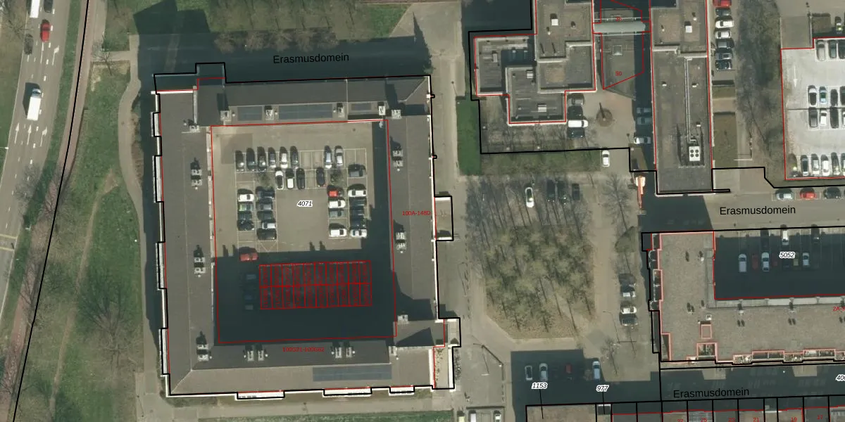 Het perceel waarop Erasmusdomein 124-E staat heeft een oppervlakte van 4995 m². Dit is een zeer groot perceel. De perceeloppervlakte wordt geregistreerd door het Kadaster. Gedetailleerde informatie over de maten van dit perceel kunt u vinden in het rapport Kadastrale kaart met maatvoering van Erasmusdomein 124-E.