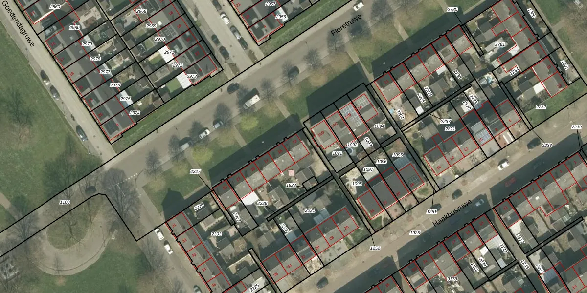 Het perceel waarop Floretruwe 13 staat heeft een oppervlakte van 1295 m². Dit is een zeer groot perceel. De perceeloppervlakte wordt geregistreerd door het Kadaster. Gedetailleerde informatie over de maten van dit perceel kunt u vinden in het rapport Kadastrale kaart met maatvoering van Floretruwe 13.
