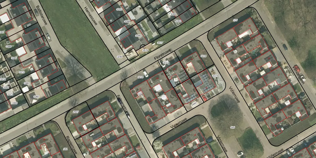 Het perceel waarop Floretruwe 35 staat heeft een oppervlakte van 1114 m². Dit is een zeer groot perceel. De perceeloppervlakte wordt geregistreerd door het Kadaster. Gedetailleerde informatie over de maten van dit perceel kunt u vinden in het rapport Kadastrale kaart met maatvoering van Floretruwe 35.