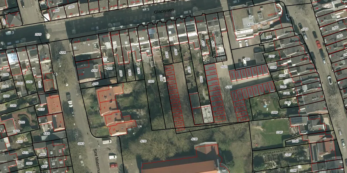 Glacisweg 1-G-41 is gelegen op kadastraal perceel PTR00B4244. Deze kadastrale aanduiding is uniek en wordt gebruikt door het Kadaster om eigendomsrechten en andere zakelijke rechten vast te leggen. Het perceel maakt onderdeel uit van de kadastrale gemeente Sint Pieter.