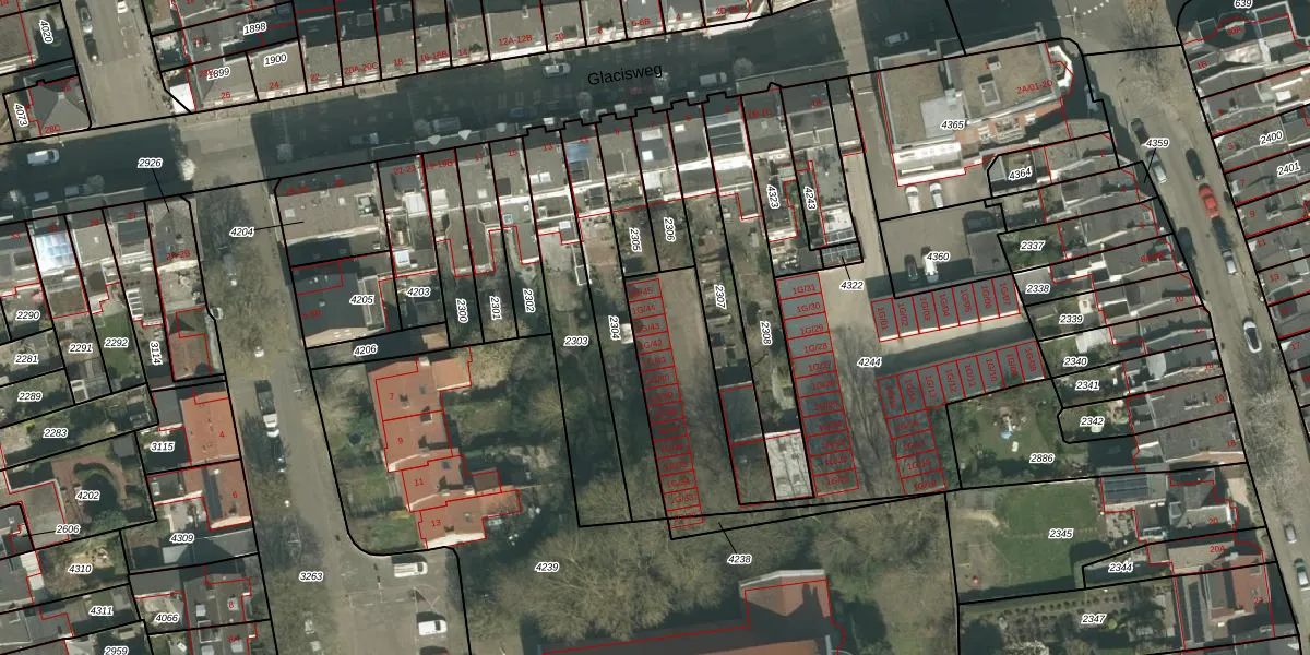 Glacisweg 1-G-43 is gelegen op kadastraal perceel PTR00B4244. Deze kadastrale aanduiding is uniek en wordt gebruikt door het Kadaster om eigendomsrechten en andere zakelijke rechten vast te leggen. Het perceel maakt onderdeel uit van de kadastrale gemeente Sint Pieter.