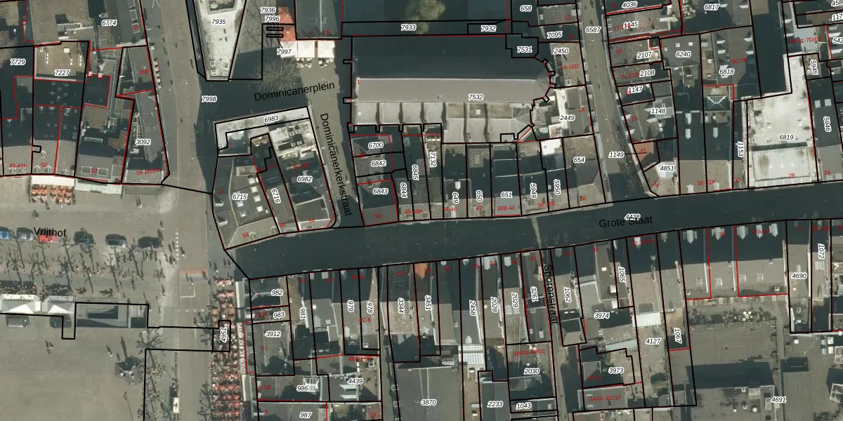Het perceel waarop Grote Staat 48-A staat heeft een oppervlakte van 94 m². Dit is een klein perceel. De perceeloppervlakte wordt geregistreerd door het Kadaster. Gedetailleerde informatie over de maten van dit perceel kunt u vinden in het rapport Kadastrale kaart met maatvoering van Grote Staat 48-A.