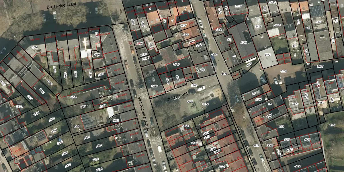 Het perceel waarop Jekerstraat 12 staat heeft een oppervlakte van 65 m². Dit is een klein perceel. De perceeloppervlakte wordt geregistreerd door het Kadaster. Gedetailleerde informatie over de maten van dit perceel kunt u vinden in het rapport Kadastrale kaart met maatvoering van Jekerstraat 12.