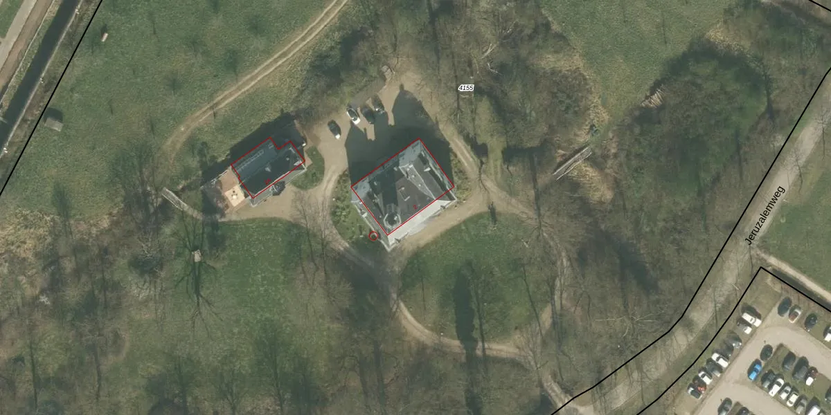 Het perceel waarop Jeruzalemweg 2 staat heeft een oppervlakte van 3,0 ha. Dit is een zeer groot perceel. De perceeloppervlakte wordt geregistreerd door het Kadaster. Gedetailleerde informatie over de maten van dit perceel kunt u vinden in het rapport Kadastrale kaart met maatvoering van Jeruzalemweg 2.