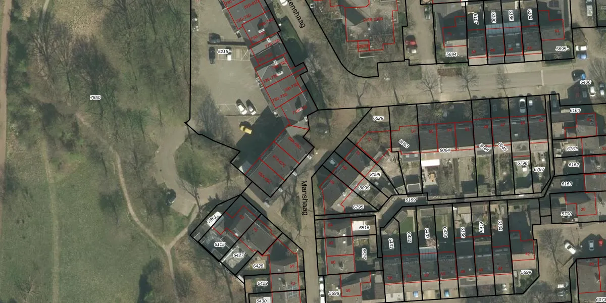 Het perceel waarop Manshaag 69-A staat heeft een oppervlakte van 2645 m². Dit is een zeer groot perceel. De perceeloppervlakte wordt geregistreerd door het Kadaster. Gedetailleerde informatie over de maten van dit perceel kunt u vinden in het rapport Kadastrale kaart met maatvoering van Manshaag 69-A.